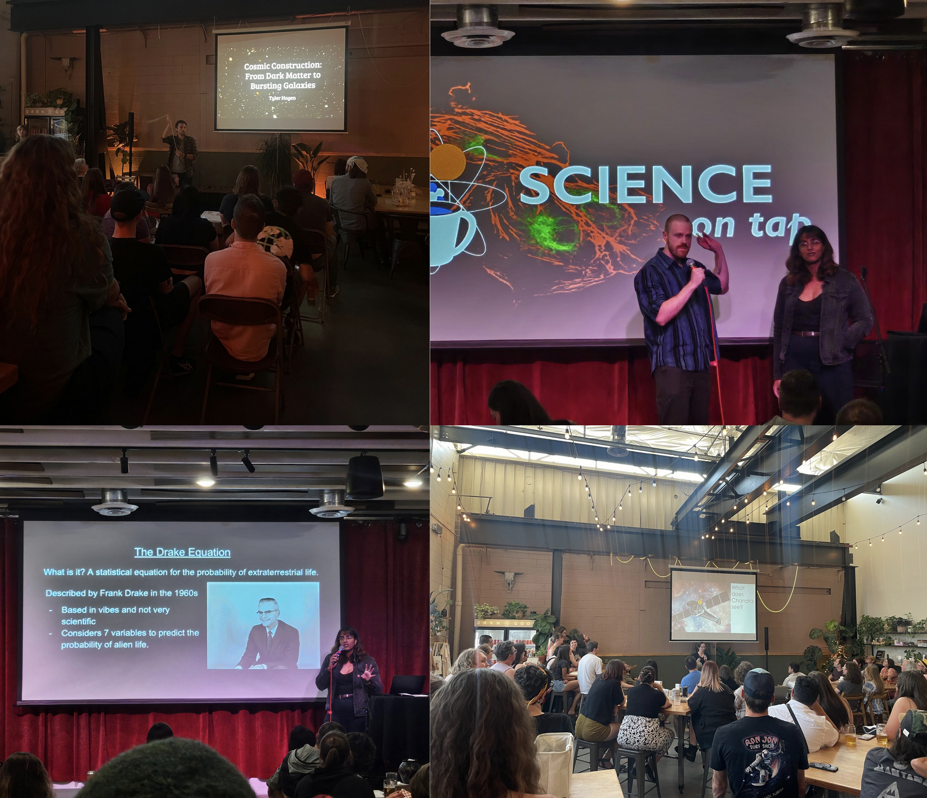 Astronomy on Tap is a global organization started by astronomers in NYC to foster public awarness of astrophysical research, primarily through bars. The Salt Lake City chapter was started in 2022, and I took over as the organizer and host in 2023. In the past three years, I have over doubled the number of attendees (our record event attendance is ~150 people!!) per event, and have in total reached hundreds of people. Through my work on AoT, I have also developed strong connections between the astronomy community, local businesses, and the general public in SLC. I also worked closely with graduate students in other departments to advise on the creation of a more general Science on Tap, which has proven similarly successful.